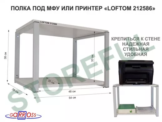 Полка под МФУ или принтер, высота 38см серый "LOFTOM 212586" две полки 35х54см, сосна выбеленная