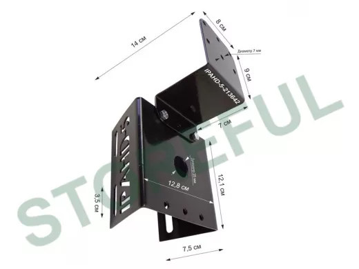 • С данным кронштейном нет необходимости в фиксации дополнительного крепежа под установку камеры и прожектора, все крепежные отверстия имеются на кронштейне. Три отверстия вверху диаметром 7мм и шагом 30мм и три внизу позволяют закрепить опции: водо-снего-солнце защитный козырёк (код товара: 90396) или светодиодный прожектор.