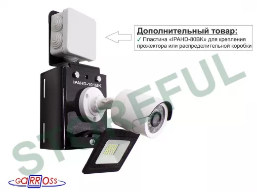 • Конструкция кронштейна позволяет крепить дополнительную опцию в виде разводной коробки, для укладки соединительных электропроводов от камеры и прожектора.