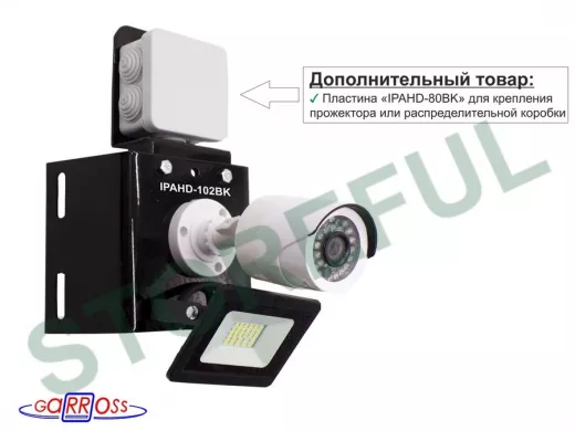 • Конструкция кронштейна позволяет крепить дополнительную опцию в виде разводной коробки, для укладки соединительных электропроводов от камеры и прожектора.