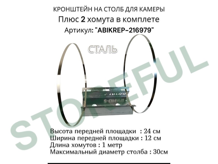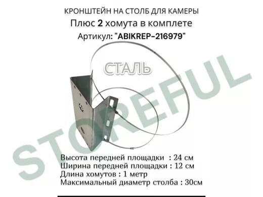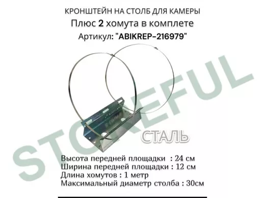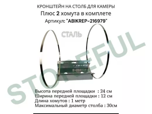 Кронштейн оцинкованный для камеры видеонаблюдения с хомутами на столб "ABIKREP-216979" 24х12см, 2отв