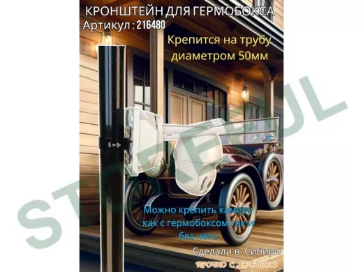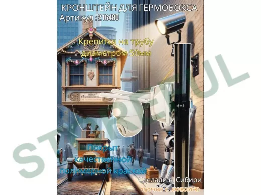 • Универсальный усиленный кронштейн предназначен для крепления гермобоксов,коробок с видеокамерой, дорожных знаков ,электрощитков на трубе диаметром 50мм.