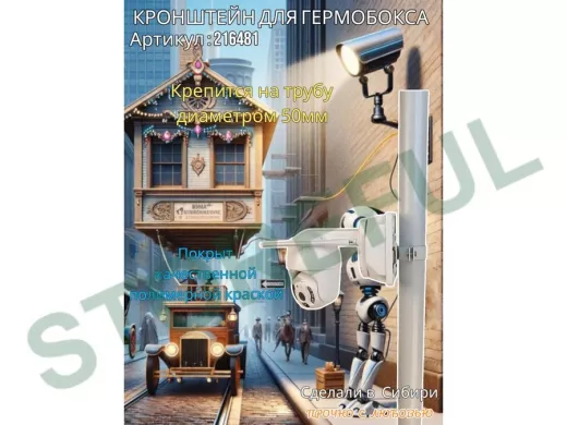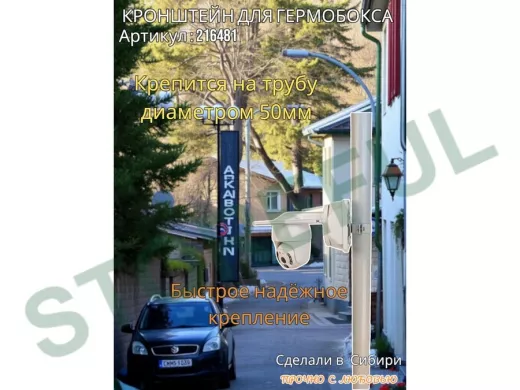 • Универсальный усиленный кронштейн предназначен для крепления гермобоксов,коробок с видеокамерой, дорожных знаков ,электрощитков на трубе диаметром 50мм.