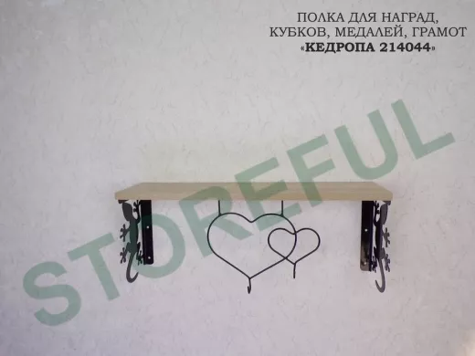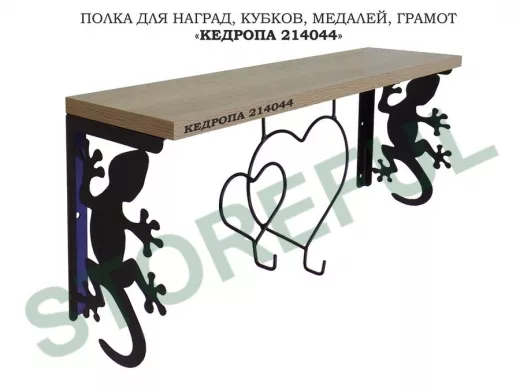 Полка для наград, кубков, медалей, грамот "КЕДРОПА-214044 гекон" размер 15х60х24 см, дуб с сердцем