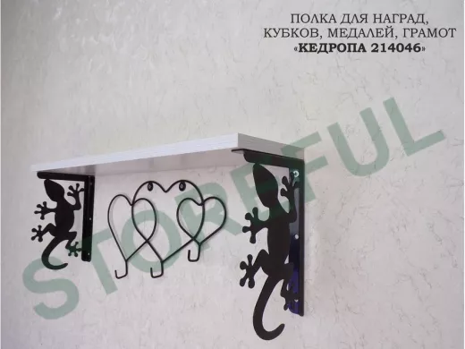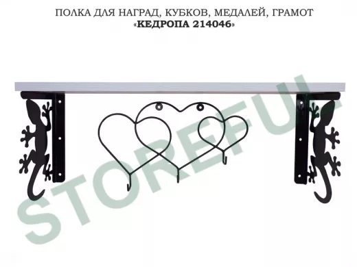 Полка для наград, кубков, медалей, грамот "КЕДРОПА-214046 гекон"размер 15х60х24 см, сосна с сердцами