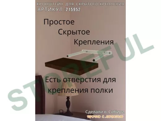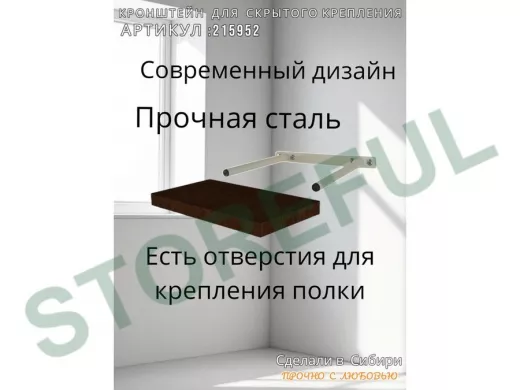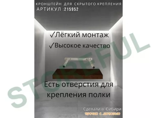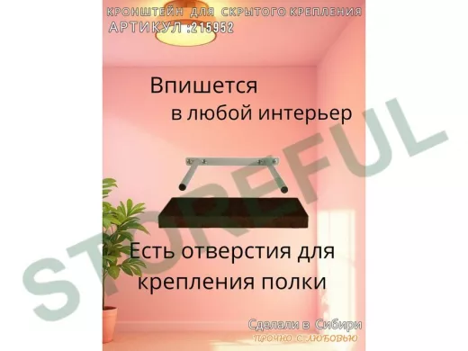 • Кронштейн предназначен для скрытого крепления полок, изготовленных из различных материалов: МДФ, ДСП, дерево, пластик.