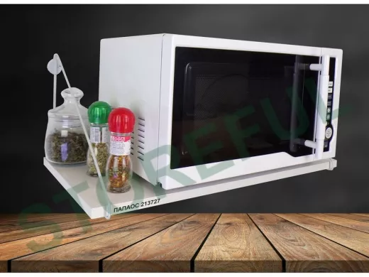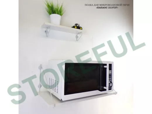 • Полка надежно крепится к стене при помощи анкеров или шурупов с дюбелями, на ней можно разместить микроволновую печь, кухонную технику, посуду, специи и многое другое