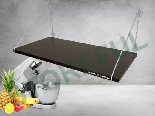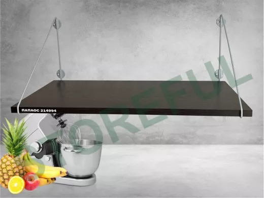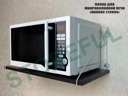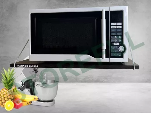 • Полка надежно крепится к стене при помощи анкеров или шурупов с дюбелями, на ней можно разместить микроволновую печь, кухонную технику, посуду, специи и многое другое