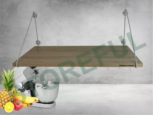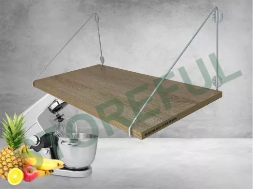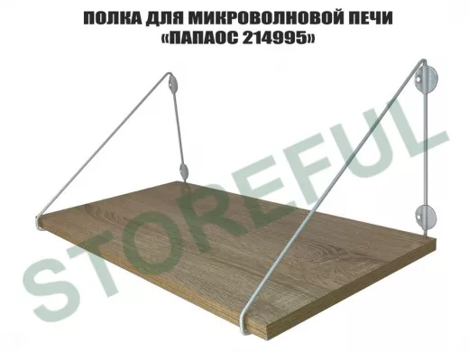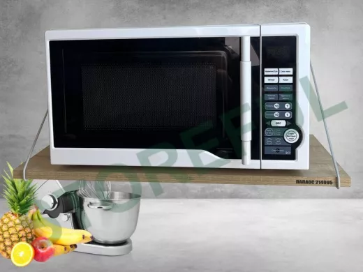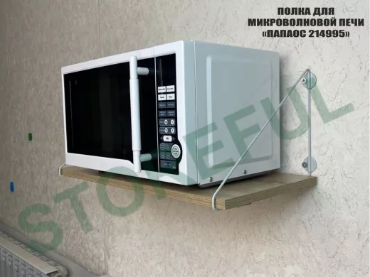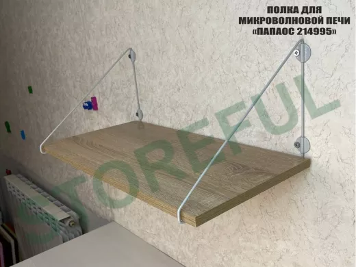 • Полка надежно крепится к стене при помощи анкеров или шурупов с дюбелями, на ней можно разместить микроволновую печь, кухонную технику, посуду, специи и многое другое