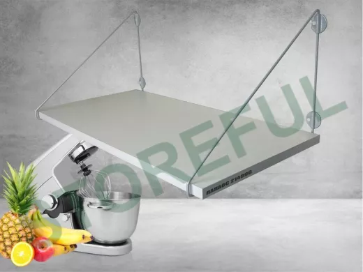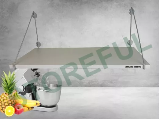 • Полка надежно крепится к стене при помощи анкеров или шурупов с дюбелями, на ней можно разместить микроволновую печь, кухонную технику, посуду, специи и многое другое