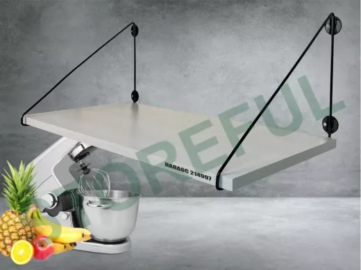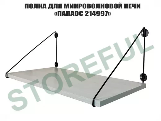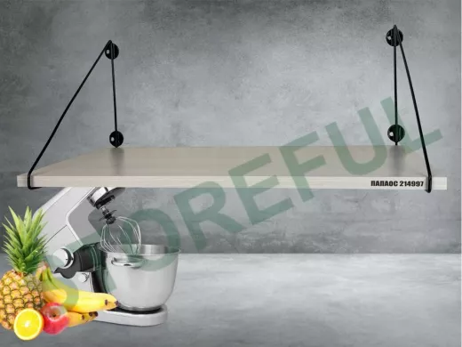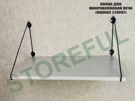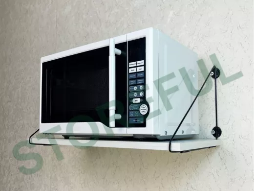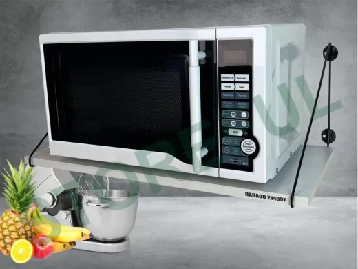 • Полка надежно крепится к стене при помощи анкеров или шурупов с дюбелями, на ней можно разместить микроволновую печь, кухонную технику, посуду, специи и многое другое