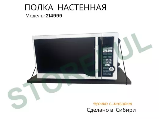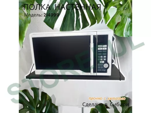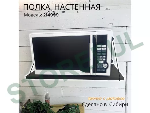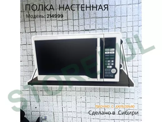 • Полка надежно крепится к стене при помощи анкеров или шурупов с дюбелями, на ней можно разместить микроволновую печь, кухонную технику, посуду, специи
