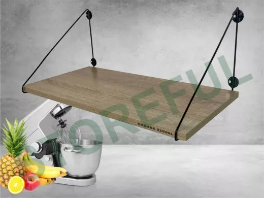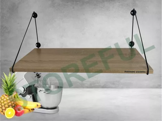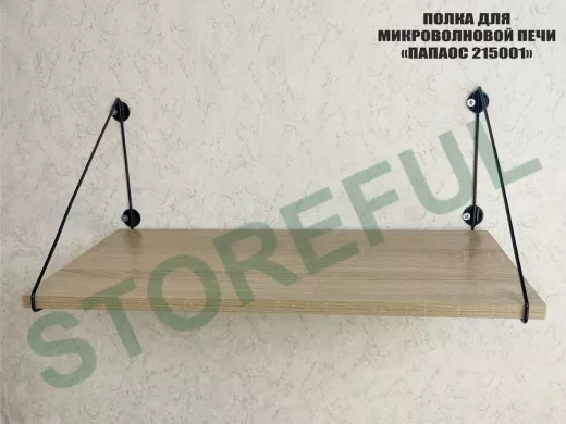• Полка надежно крепится к стене при помощи анкеров или шурупов с дюбелями, на ней можно разместить микроволновую печь, кухонную технику, посуду, специи