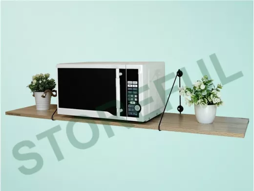 • Полка надежно крепится к стене при помощи анкеров или шурупов с дюбелями, на ней можно разместить микроволновую печь, кухонную технику, посуду, специи