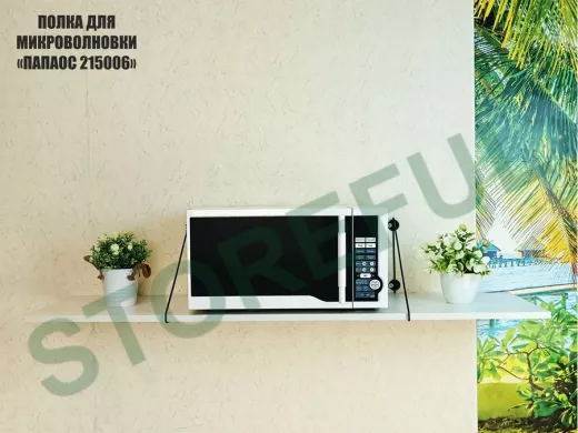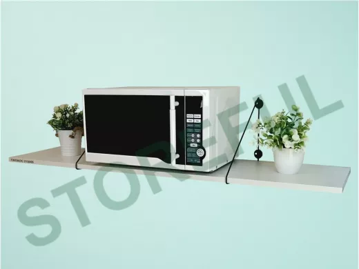 • Полка надежно крепится к стене при помощи анкеров или шурупов с дюбелями, на ней можно разместить микроволновую печь, кухонную технику, посуду, специи