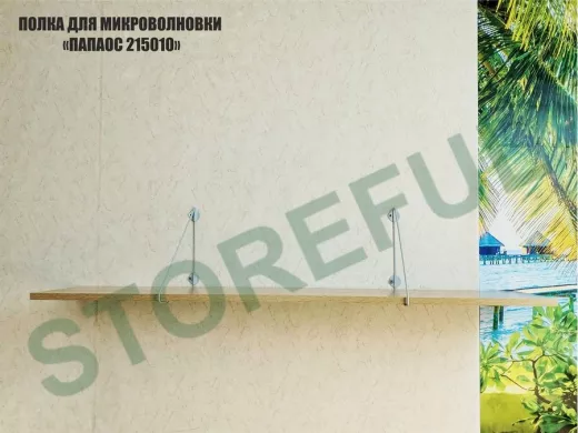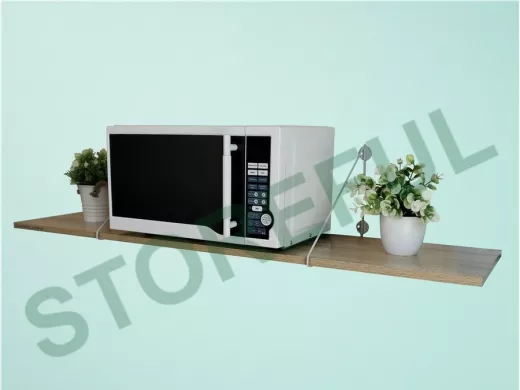• Полка надежно крепится к стене при помощи анкеров или шурупов с дюбелями, на ней можно разместить микроволновую печь, кухонную технику, посуду, специи