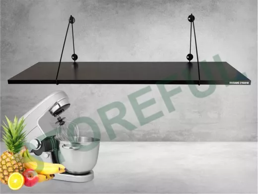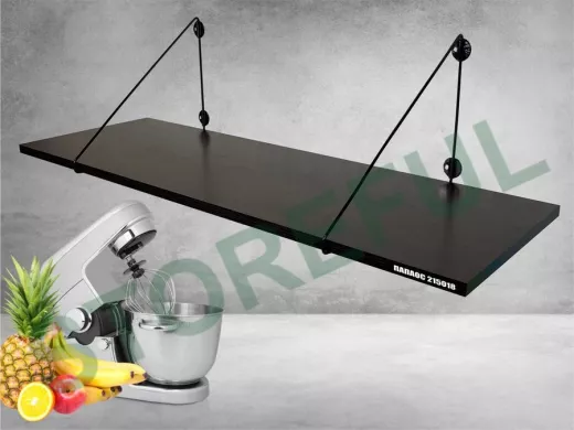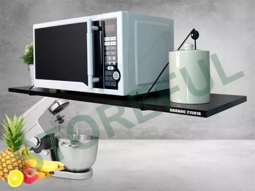 • Полка надежно крепится к стене при помощи анкеров или шурупов с дюбелями, на ней можно разместить микроволновую печь, кухонную технику, посуду, специи