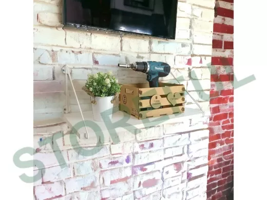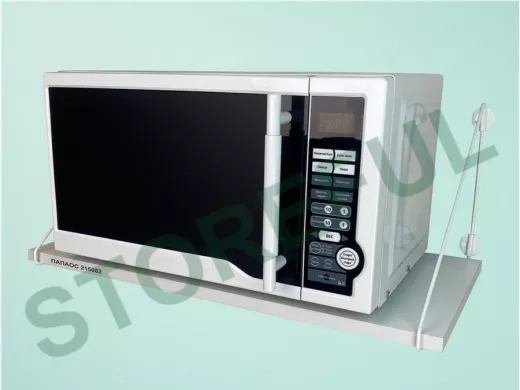 • Полка надежно крепится к стене при помощи анкеров или шурупов с дюбелями, на ней можно разместить микроволнрвую печь, кухонную технику, посуду, специи.