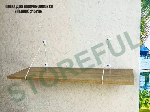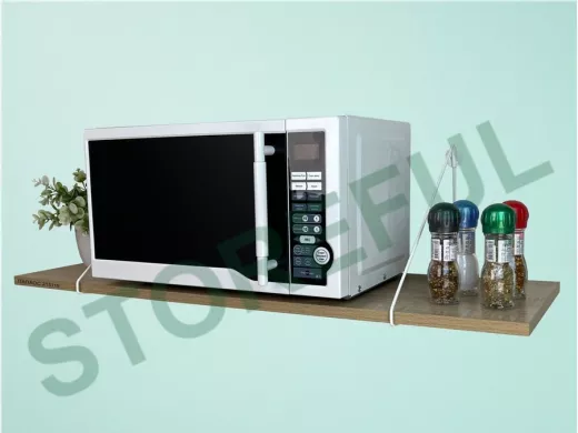 • Полка надежно крепится к стене при помощи анкеров или шурупов с дюбелями, на ней можно разместить микроволновую печь, кухонную технику, посуду, специи