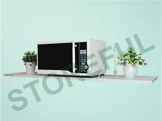 • Полка надежно крепится к стене при помощи анкеров или шурупов с дюбелями, на ней можно разместить микроволновую печь, кухонную технику, посуду, специи
