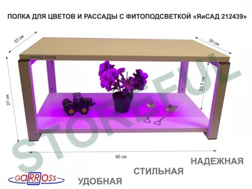 Полка для цветов и рассады с фитоподсветкой, высота 25см, серый "ЯиСАД 212439" 60х30, сосна