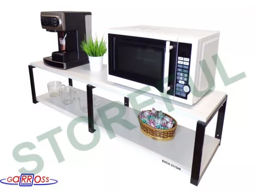 • Полка надежно крепится к стене при помощи анкеров или шурупов с дюбелями, на ней можно разместить микроволнрвую печь, кухонную технику, посуду, специи