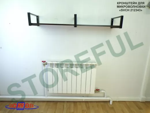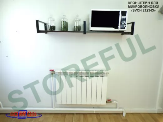 • Полка надежно крепится к стене при помощи анкеров или шурупов с дюбелями, на ней можно разместить микроволновую печь, кухонную технику, посуду, специи