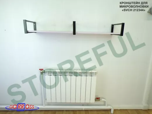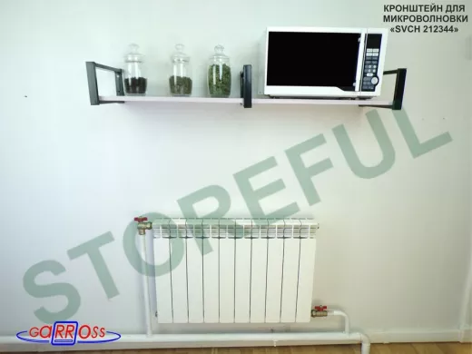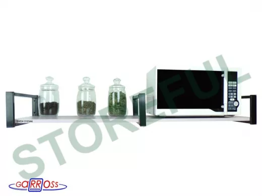 • Полка надежно крепится к стене при помощи анкеров или шурупов с дюбелями, на ней можно разместить микроволнрвую печь, кухонную технику, посуду, специи