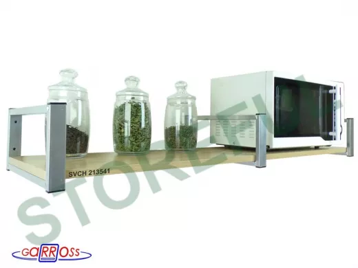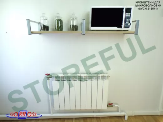• Полка надежно крепится к стене при помощи анкеров или шурупов с дюбелями, на ней можно разместить микроволнрвую печь, кухонную технику, посуду, специи