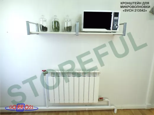• Полка надежно крепится к стене при помощи анкеров или шурупов с дюбелями, на ней можно разместить микроволнрвую печь, кухонную технику, посуду, специи