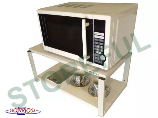 • Полка надежно крепится к стене при помощи анкеров или шурупов с дюбелями, на ней можно разместить микроволнрвую печь, кухонную технику, посуду, специи