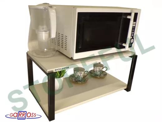 • Полка надежно крепится к стене при помощи анкеров или шурупов с дюбелями, на ней можно разместить микроволнрвую печь, кухонную технику, посуду, специи