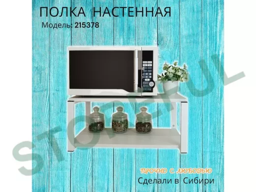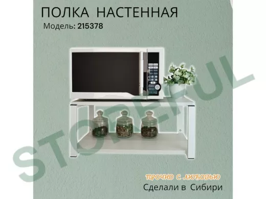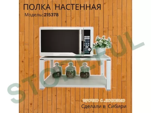 • Полка надежно крепится к стене при помощи анкеров или шурупов с дюбелями, на ней можно разместить микроволновую печь, кухонную технику, посуду, специи
