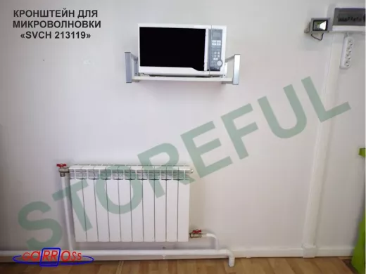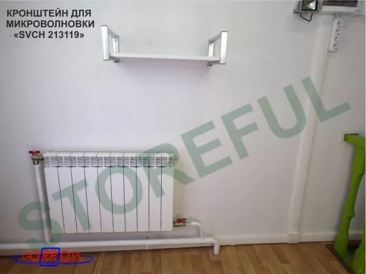 • Полка надежно крепится к стене при помощи анкеров или шурупов с дюбелями, на ней можно разместить микроволновую печь, кухонную технику, посуду, специи