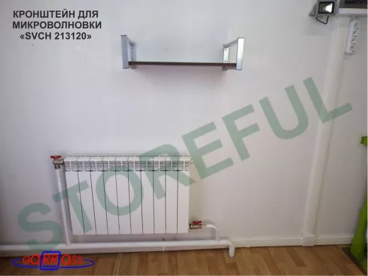 • Полка надежно крепится к стене при помощи анкеров или шурупов с дюбелями, на ней можно разместить микроволновую печь, кухонную технику, посуду, специи