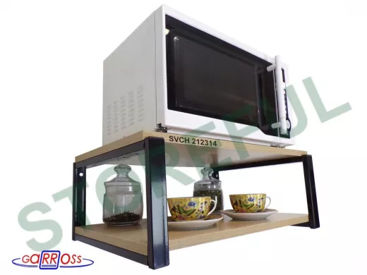 • Полка надежно крепится к стене при помощи анкеров или шурупов с дюбелями, на ней можно разместить микроволновую печь, кухонную технику, посуду, специи