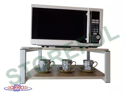 • Полка надежно крепится к стене при помощи анкеров или шурупов с дюбелями, на ней можно разместить микроволновую печь, кухонную технику, посуду, специи