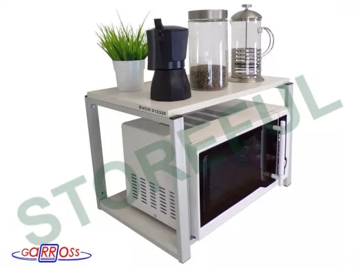 • Полка надежно крепится к стене при помощи анкеров или шурупов с дюбелями, на ней можно разместить микроволнрвую печь, кухонную технику, посуду, специи