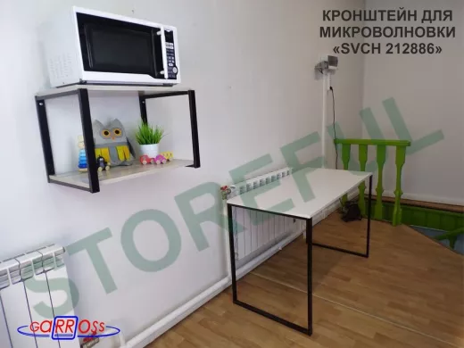 • Полка надежно крепится к стене при помощи анкеров или шурупов с дюбелями, на ней можно разместить микроволнрвую печь, кухонную технику, посуду, специи