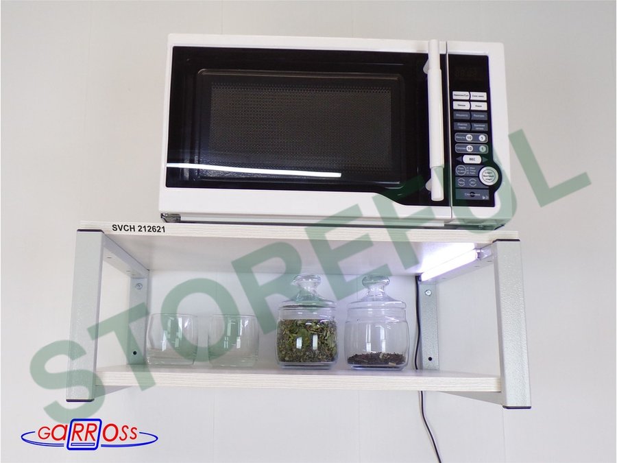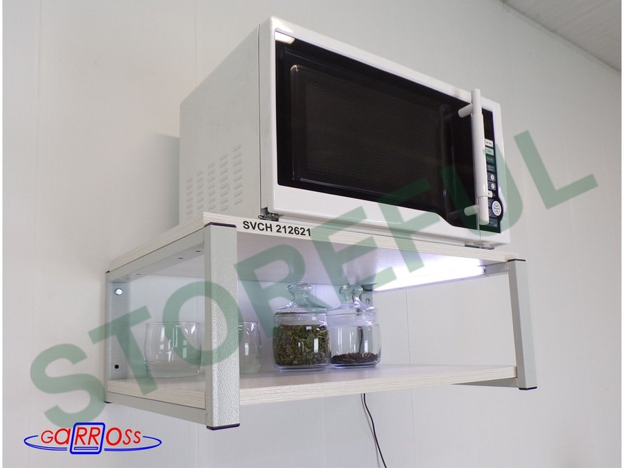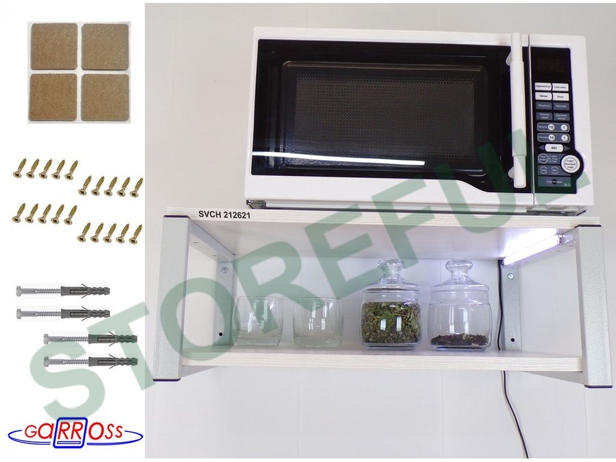 • Полка надежно крепится к стене при помощи анкеров или шурупов с дюбелями, на ней можно разместить микроволновую печь, кухонную технику, посуду, специи