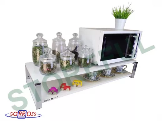 • Полка надежно крепится к стене при помощи анкеров или шурупов с дюбелями, на ней можно разместить микроволнрвую печь, кухонную технику, посуду, специи