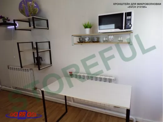 • Полка надежно крепится к стене при помощи анкеров или шурупов с дюбелями, на ней можно разместить микроволнрвую печь, кухонную технику, посуду, специи