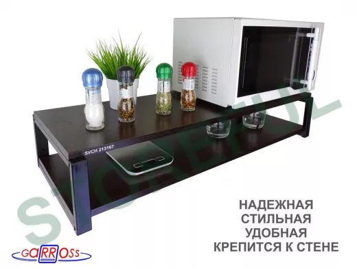• Полка надежно крепится к стене при помощи анкеров или шурупов с дюбелями, на ней можно разместить микроволнрвую печь, кухонную технику, посуду, специи