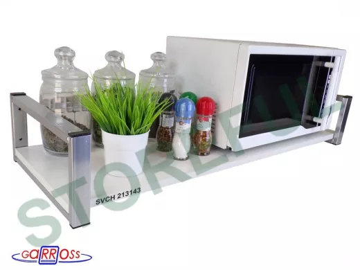 • Полка надежно крепится к стене при помощи анкеров или шурупов с дюбелями, на ней можно разместить микроволновую печь, кухонную технику, посуду, специи