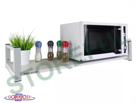 • Надежно крепится к стене при помощи шурупов с дюбелями, на ней можно разместить микроволновую печь, кофемашину, кухонную технику, посуду, специи