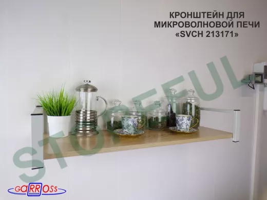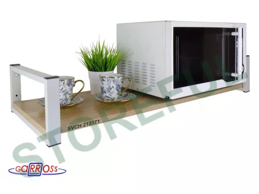 • Полка надежно крепится к стене при помощи анкеров или шурупов с дюбелями, на ней можно разместить микроволновую печь, кухонную технику, посуду, специи