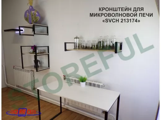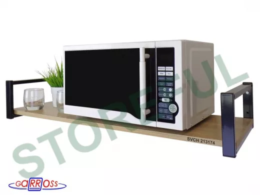 • Полка надежно крепится к стене при помощи анкеров или шурупов с дюбелями, на ней можно разместить микроволновую печь, кухонную технику, посуду, специи