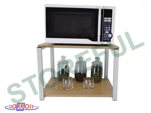• Полка надежно крепится к стене при помощи анкеров или шурупов с дюбелями, на ней можно разместить микроволнрвую печь, кухонную технику, посуду, специи