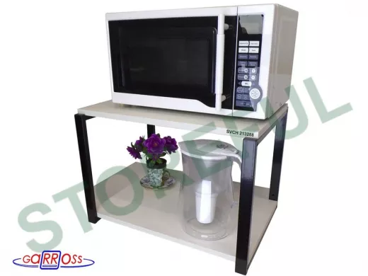 • Полка надежно крепится к стене при помощи анкеров или шурупов с дюбелями, на ней можно разместить микроволнрвую печь, кухонную технику, посуду, специи