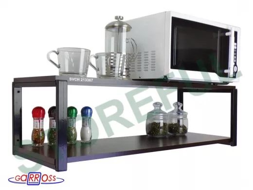 • Полка надежно крепится к стене при помощи анкеров или шурупов с дюбелями, на ней можно разместить микроволновую печь, кухонную технику, посуду, специи